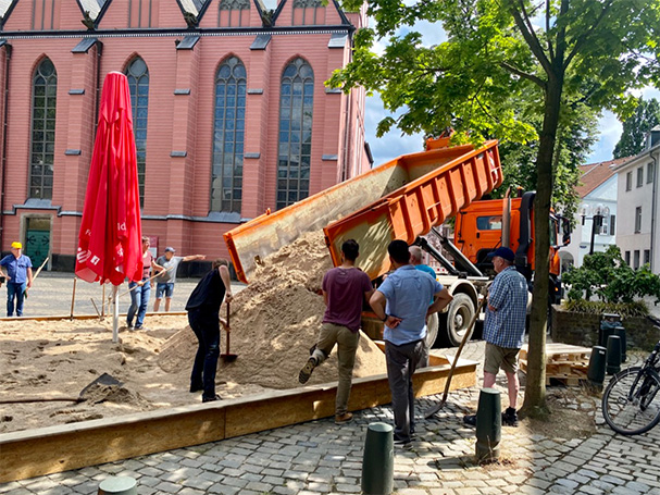 Unter dem Motto „Kinder in die Mitte“ lud während der gesamten Ferienzeit der große Sandkasten auf dem Kirchplatz mitten in Kempen zum Buddeln, Sandkuchen backen und Burgen bauen ein. Erwachsene konnten sich auf Liegestühlen und anderen Sitzgelegenheiten entspannen, während die Kleinen im Sand viel zu tun hatten. Mit einem ersten Spatenstich gaben Bürgermeister Christoph Dellmans, der Kirchenvorstand, der Lions-Club und der Kinderschutzbund den Sandkasten am Samstag, 25. Juni 2022, um 10 Uhr frei.